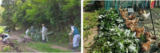 今回は、畑の除草や水路整備を行いました。除草した一部は ニワトリの餌として活用します。