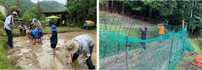 雨の中、松愛会兵庫東支部とパナソニックの従業員、そのご家族やご友人が集まり、田植えと獣害対策を行いました。