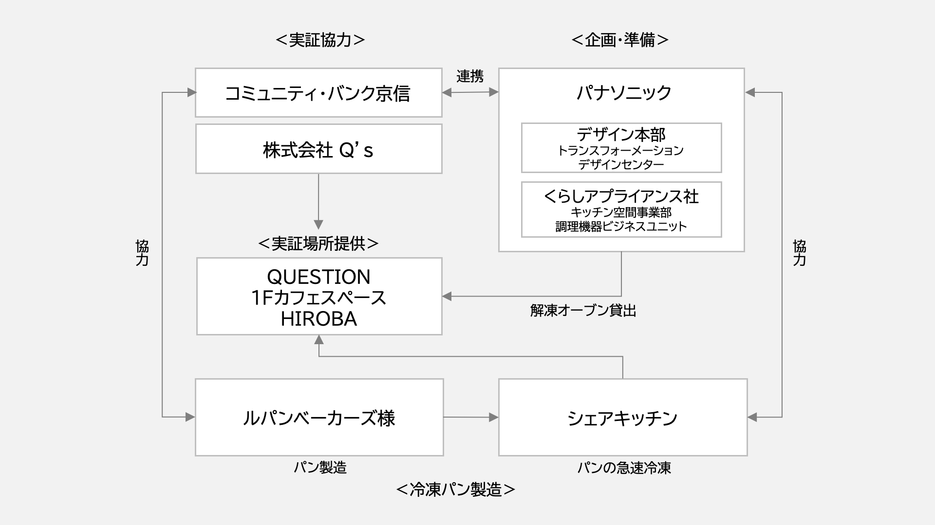 2023年から神戸など各地で実施してきた実証を踏まえ、次のステップとしたのは、地域に根付くコミュニティと事業化です。2024年秋、夕暮れの京都河原町、三条通にあるコミュニティ・バンク京信の共創施設「QUESTION」にあるカフェで開催したのは、「おなかまパン」というイベント。「同じ窯のパンを食べれば、お仲間」をコンセプトに、冷凍パンのリベイクを起点に、食を中心とした自然な交流を促す場を開きました。地域で愛されている「ルパンベーカーズ」のパンを冷凍保存した状態で準備し、「パナソニック」の業務用コンベクションオーブンでリベイクして、カフェ「HIROBA」のメニューとして提供する。この三者をつないだのは、地域に根ざして活動する「コミュニティ・バンク京信」です。