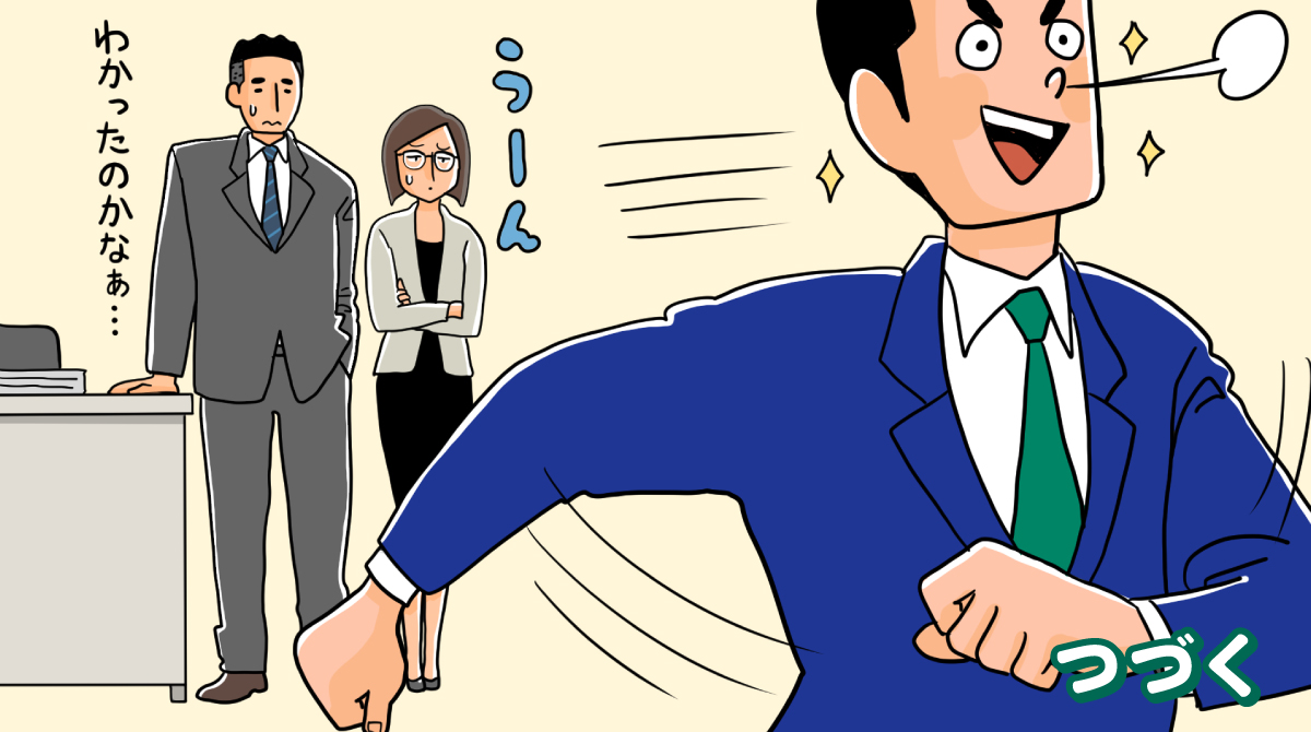 勢いよく会議室を出ようとする友野君だが、そこに二人の上司である田中課長が入ってきました。
