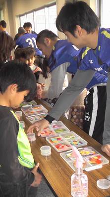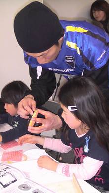 インパルスの選手も、子ども達の熱心な工作姿を目の当たりにし、一生懸命手伝いながら、