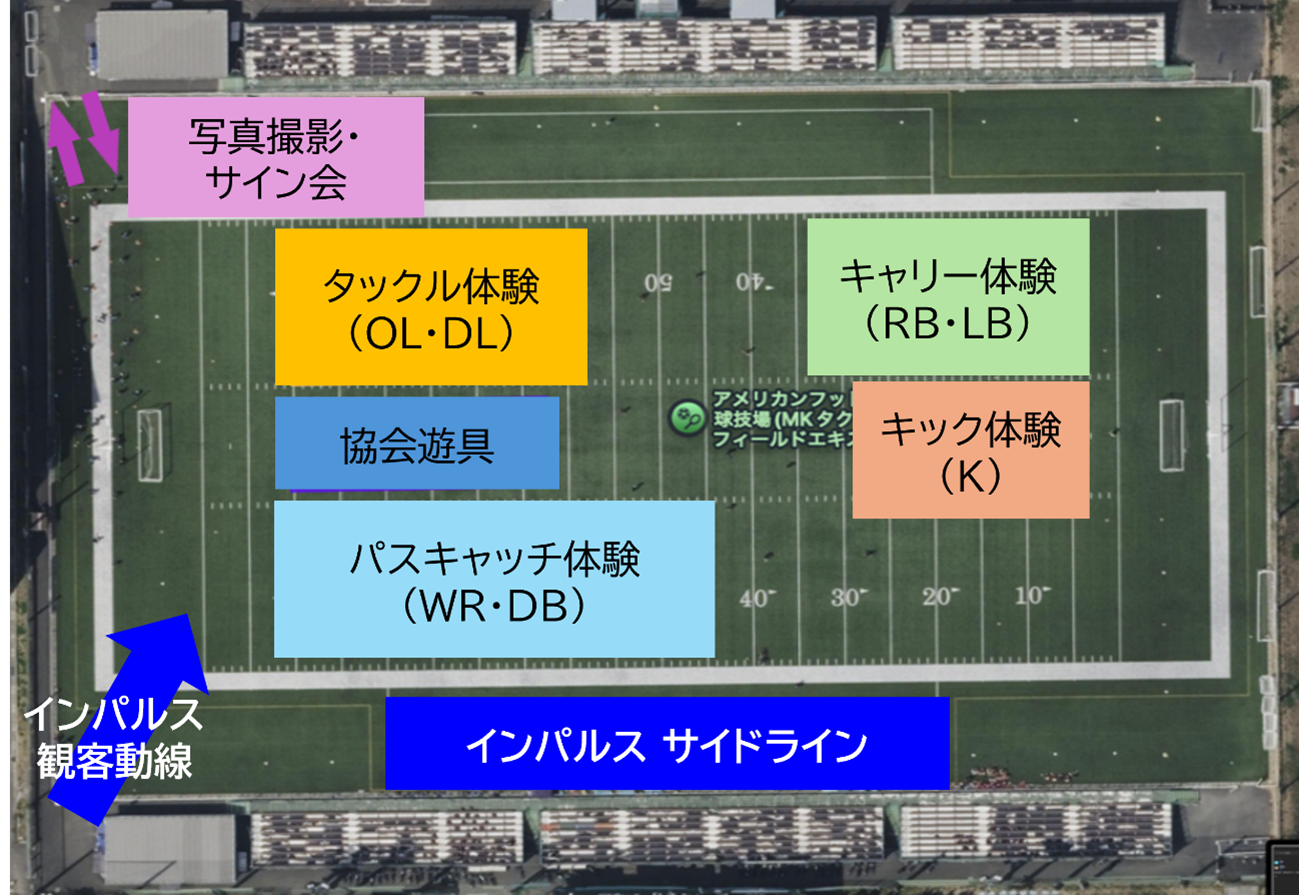 インパルス受付ブースにて集合場所をご案内しますので、キックオフ30分前(12:30)までにお集まりください