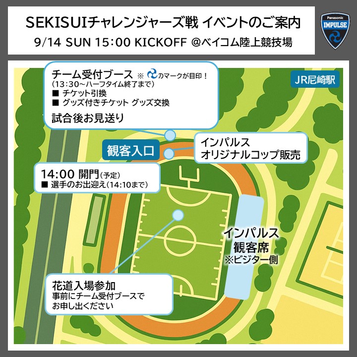 インパルス受付ブースにて集合場所をご案内しますので、キックオフ30分前(14:30)までにお集まりください