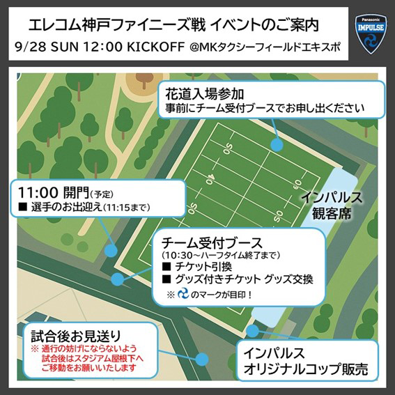 インパルス受付ブースにて集合場所をご案内しますので、キックオフ30分前(11:30)までにお集まりください