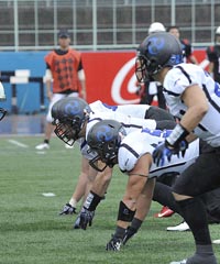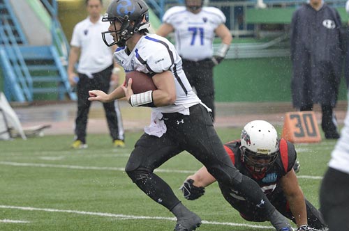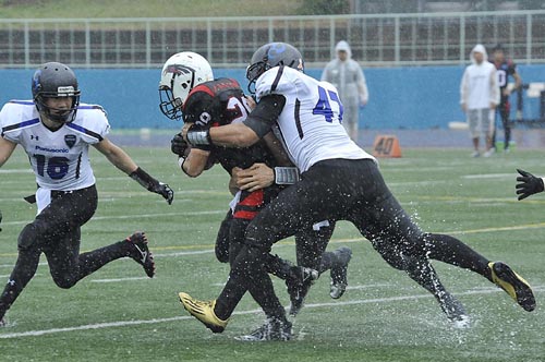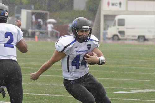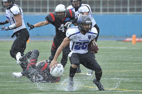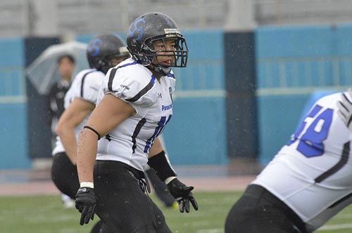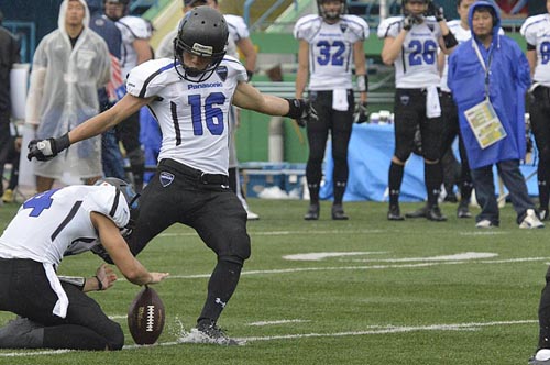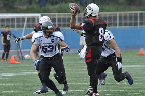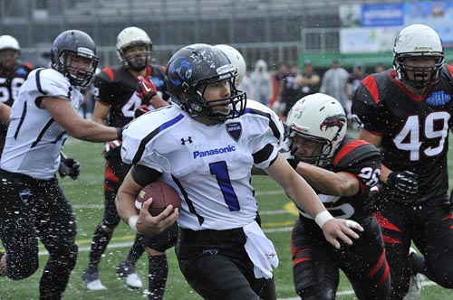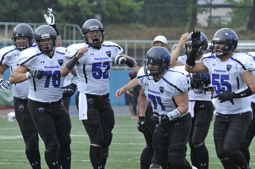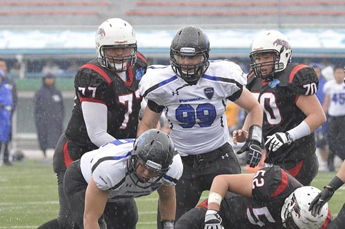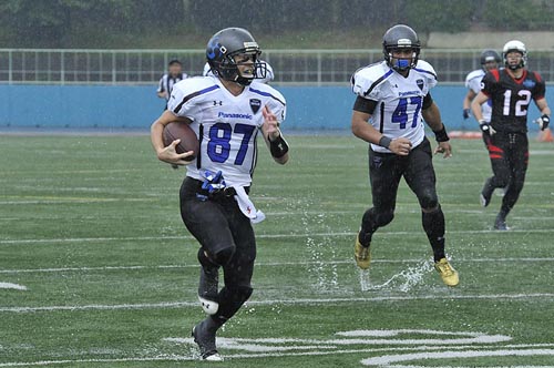 春の最終戦は、あいにくの雨の中での対戦となった。第1Q。ブラックイーグルスが、最初の攻撃シリーズで残り23YD(ヤード)地点まで攻めこむ。だがそれ以上の前進はインパルス守備陣が阻止。フィールドゴールも決まらず無得点となった。かわって攻撃権を得たインパルスは、雨を意識してか、ランプレーを中心に着実に前進する。まずRB#25須賀のランが決まり、残り32YD地点へ。ここからQB#8高田とRB#44福山のラン、TE#2岸本へのパス成功などで残り5YD地点へ。最後はRB#1小林が走りこみタッチダウン! キックも成功し7点を先制する。さらに次の相手の攻撃をパントに追い込むと、そのパントをキャッチしたリターナーWR#87佐藤がスピードに乗って快走! 味方ブロックにも助けられ、そのまま65YD近くを走ってパントリターンタッチダウン! 14対0。第2Qに入ると、しばらくは一進一退の攻防となった。それでも前半残り3分弱になってから、インパルスがチャンスをものにする。QB#18大原からTE#82林へのパス成功などで残り22YDまで前進。ここからK#11佐伯がフィールドゴールを決め3点を追加。17対0として前半を折り返した。