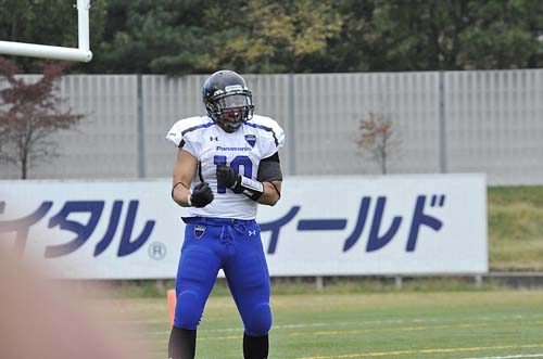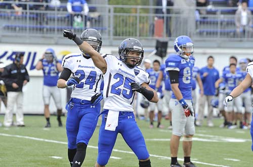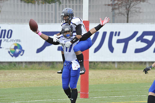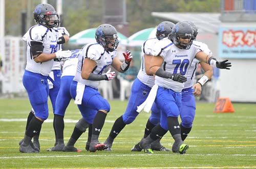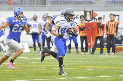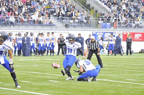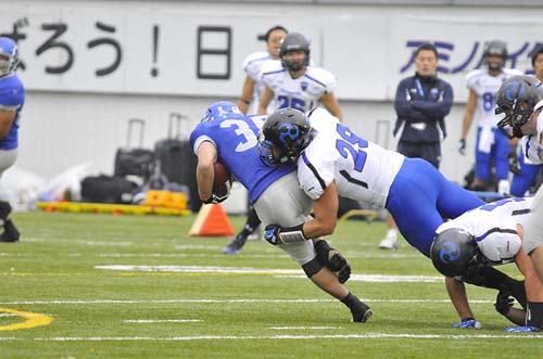 を3回重ね、残り13YD地点へ。ここからRB#33横田がエンドゾーンまで力強く走りタッチダウン。再び突き放し、24対7。ビッグブルーも意地を見せる。前半終了間際に残り31YD地点まで前進し、#8小田倉が48YDフィールドゴールを決めて24対10。