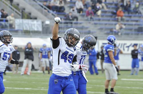 これをRB#1小林のタッチダウンランに結びつけ7点を追加する。次のビッグブルー攻撃時にも相手RBをファンブルさせ、DB#6増谷が押さえまたも攻守交代。タッチダウンは奪えなかったが、K#11佐伯が25YDのフィールドゴールを決め3点を追加。55対17。