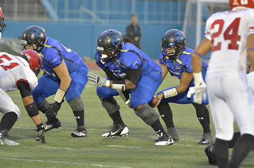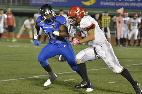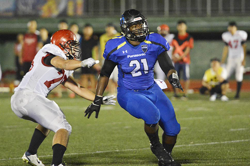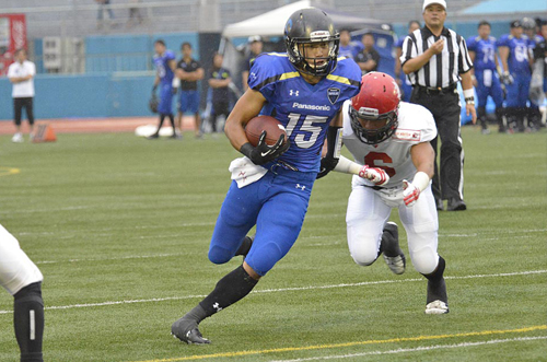 その後、インパルスは攻撃の手を緩めず、WR#4高木へのタッチダウンパスも決まり、27対0。第2Qに入ると、RB#24デュプリーのランでさらに7点を追加し、34対0。守備陣も活躍し、DB#12今西が相手パスをインターセプト。これで得たチャンスをWR#80柴田のタッチダウンパスに結びつけた。この後のリターンでは圧巻のプレーが出る。なんと相手パントを2回受けたPR#24デュプリーが、その2回ともリターンタッチダウン! 55対0とした。前半終了前には、RB#39荒木の28YDタッチダウンランも決まり、62対0という大差で前半が終わった。