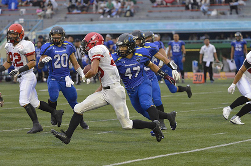 後半。J-Starsの攻撃をあっさりパントに追い込み、敵陣45YD地点から攻撃を開始したインパルスは、RB#34橋本が連続でボールを持ち、力強く前進。ダウン更新を重ねて残り7YD地点とすると、最後も橋本がエンドゾーンに走りこんでタッチダウン! 69対0とする。反撃したいJ-Starsだったが、インパルスの守備陣に完璧に抑えこまれ、ダウン更新すらできない状態が続く。そして第4Q。インパルスがさらに容赦なく得点を重ねた。残り38YD地点から、QB#18大原が巧みに相手タックルをかわして激走。一気にエンドゾーンまで到達してタッチダウン。76対0。守備ではDL#53山口がQBサックを決め、相手の攻撃をパントに追い込む。この後、RB#33横田が中央突破から、一気に残り33YDを走ってタッチダウンを奪い7点を追加。さらに試合終了間際には、相手パントを受けたPR#83木下がスピードをいかし、58YDのリターンタッチダウンを決める。90対0。試合はこのまま終わり、インパルスが完封での勝利をおさめた。
