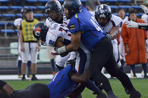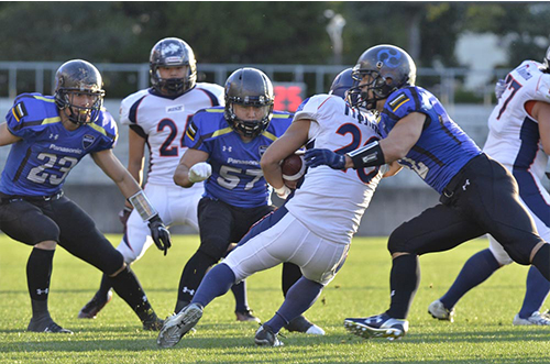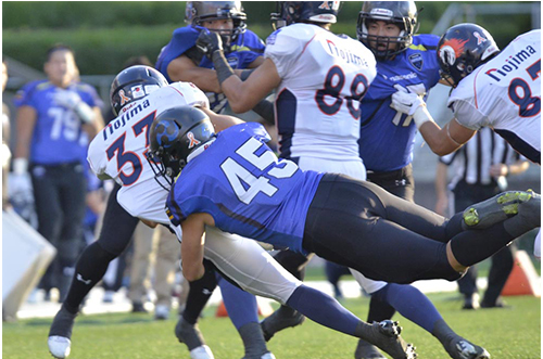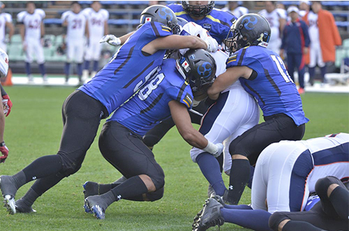 さらにはP#16佐伯(眞)のナイスパントで、ライズの攻撃を自陣2YDからという苦しいポジションにすると、エンドゾーン内でボールを持った相手RBに、LB#47松永が強烈タックル!セーフティの2点をもぎとった。