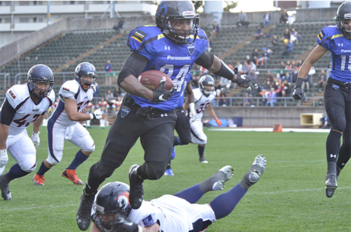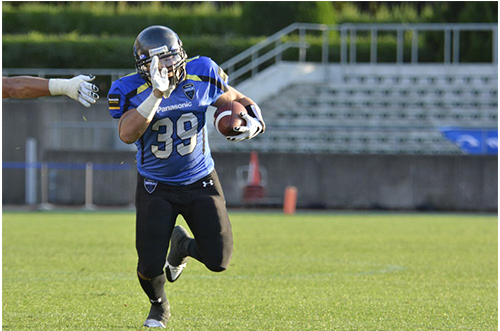 一度は相手守備陣に後退させられるものの、次のプレーでQB#8高田からのパスを受けたRB#24デュプリーが、タックルをかわして走る!