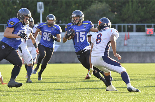 自陣9YD(ヤード)から、QBアンダーソンのランで前進すると、続くプレーで#7井本へのロングパスが決まり、一気に残り33YD地点へ。