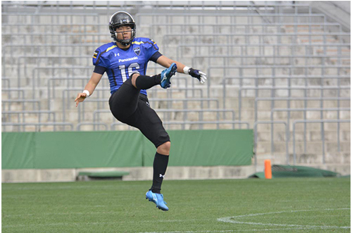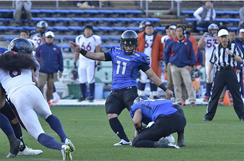 すると次の攻撃シリーズで、インパルスがゴールに迫る。自陣9YDからQB#8高田と、RB#39荒木のランで前進。さらに、パスを受けたRB#24デュプリーが鋭い走りで37YDをゲインし、敵陣25YD地点まで進む。だがここからの攻撃は止められる。39YDのフィールドゴール狙いとなったが、このキックをK#11佐伯(栄)が見事に決め、インパルスが3点を先制した。
