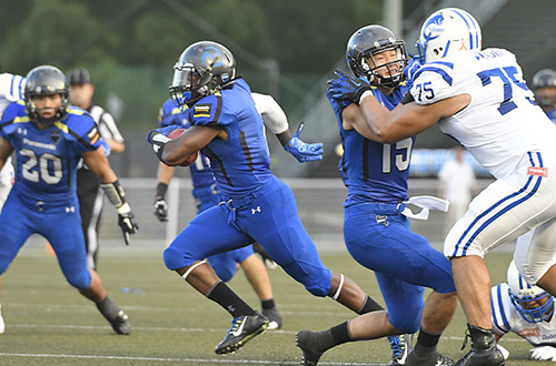 さらに、次の自陣16YD地点からの攻撃では、QB#18大原のラン、WR#15頓花へのパス成功、RB#33横田のランなどで残り28YD地点へ。