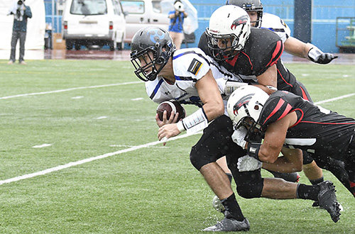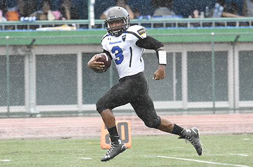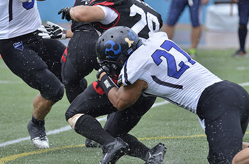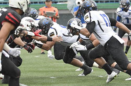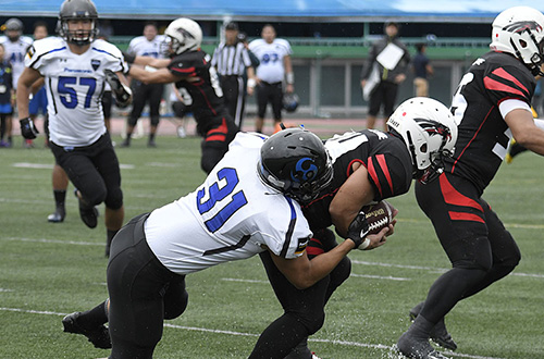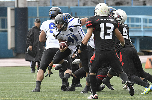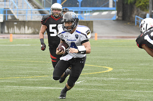 守備では、DL#93油谷がQBサックを決めるなど、相手の前進を許さない。