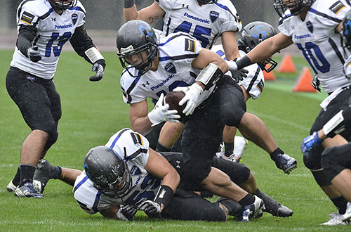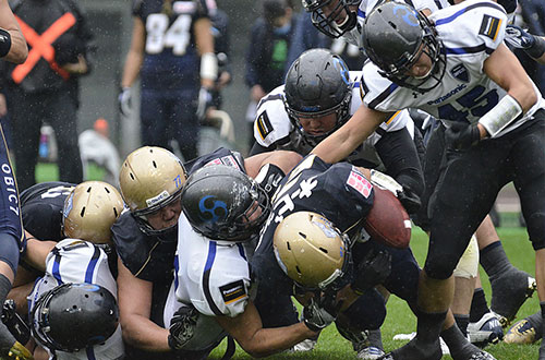 シーガルズは自陣10YD(ヤード)から#32原のランプレー。するとDB#12今西が強烈タックルを浴びせ、ボールをファンブルさせる。