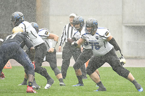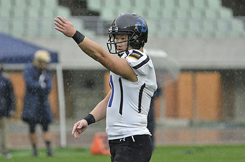 しかしその直後のシーガルズの攻撃。QB菅原が#84西村へのロングパスを決め、残り9YD地点まで攻め込んでくる。