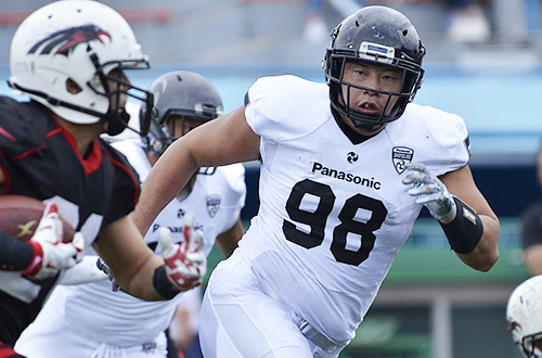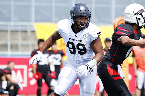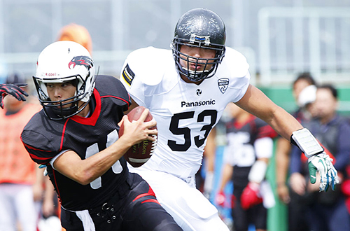 DL#21ジョーンズ、DL#9武田が連続でQBサックを決める。さらにDB#3秋山のパスインターセプトもあり、相手の前進を許さない。