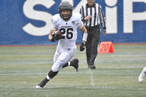 後半。ライズが反撃する。自陣36YDからの攻撃で、QBガードナーのランを中心にダウン更新を3度重ね、残り3YD地点まで攻め込むと、最後は#39ホマが走り込んでタッチダウン。キックは決まらなかったが、21対20と詰め寄ってきたのだ。