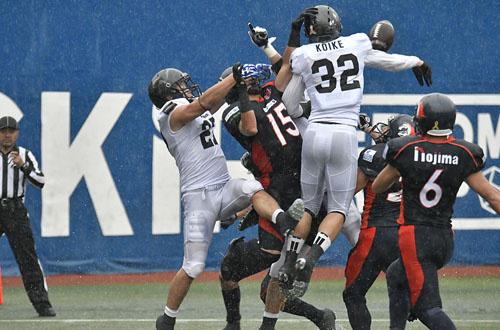 ライズも諦めない。ダウン更新を重ねて残り36YD地点とすると、ここからQBガードナーが一気に駆け上がりタッチダウン。28対26。2点コンバージョンが決まれば同点である。だが、それを狙った相手パスをDB#27辻が見事にカット! 2点リードを守ってみせた。