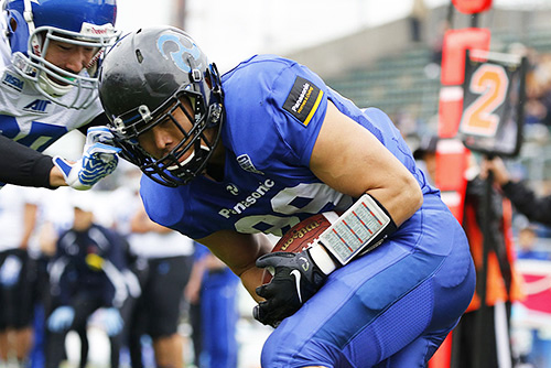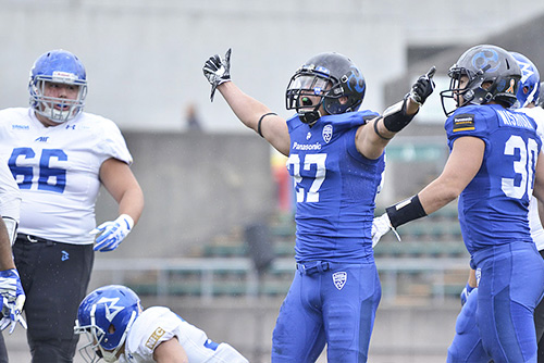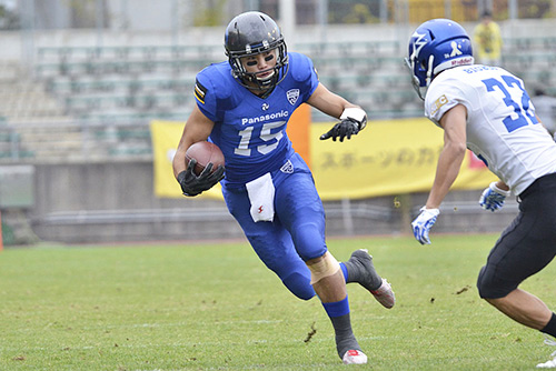 岸本はそのままエンドゾーンに飛び込み、タッチダウン!14対7と逆転する。