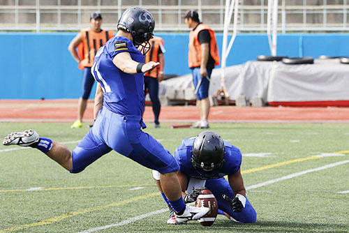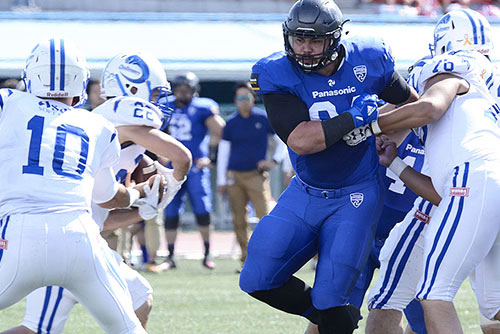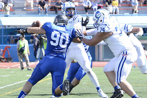 それでも守備陣は堅固で、DL#92有村がQBサックを決めるなど、相手にチャンスを与えなかった。