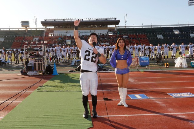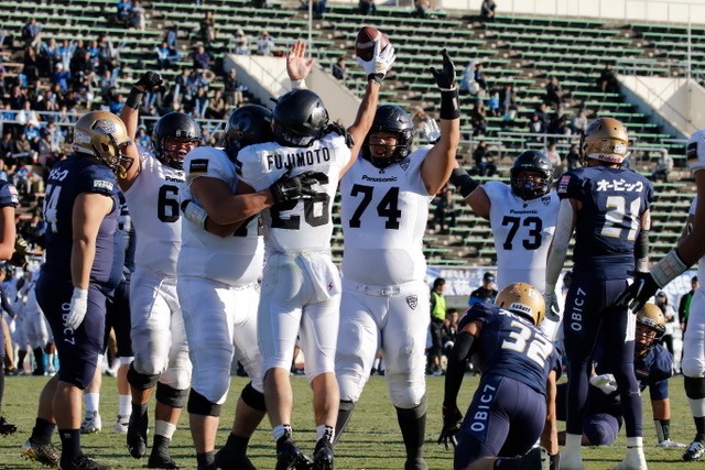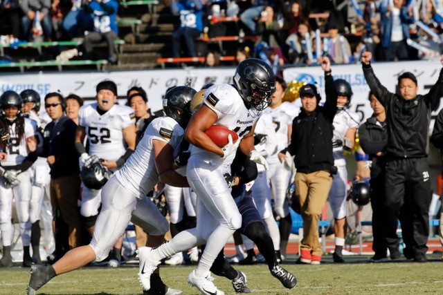 ゴール前2ヤードでTDを狙った第4ダウンギャンブルをオービック守備に阻止されて追加点ならず。