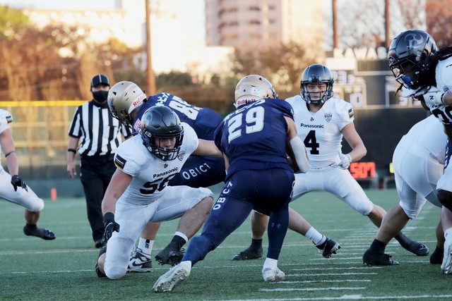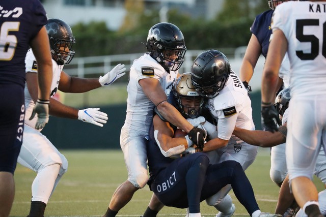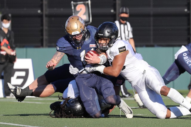 守備も粘りを見せた。オービックの攻撃に進まれながらも#20DB齋藤健太、#40LBワイズマン・モーゼス海人が強烈なロスタックルで対抗。ゴール前4ヤードに迫られた場面では、スクランブルに出た相手QBを、#21DB 清家太志と#56DL 加藤聖貴が激しいタックルで捉えてファンブルを誘い、このボールを#27DB辻篤志がリカバーしてピンチをしのいだ。