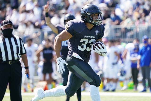 直後の守備では、IBMが試みたスペシャルプレーをLB#47 小西憂とLB#56 加藤聖貴がすばやく見切ってロスタックルに仕留めると、攻撃はIBMのプレッシャーの裏を突くスクリーンパスでRBミッチェルが40ヤード独走TD。