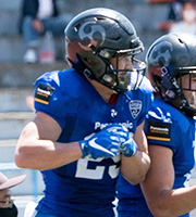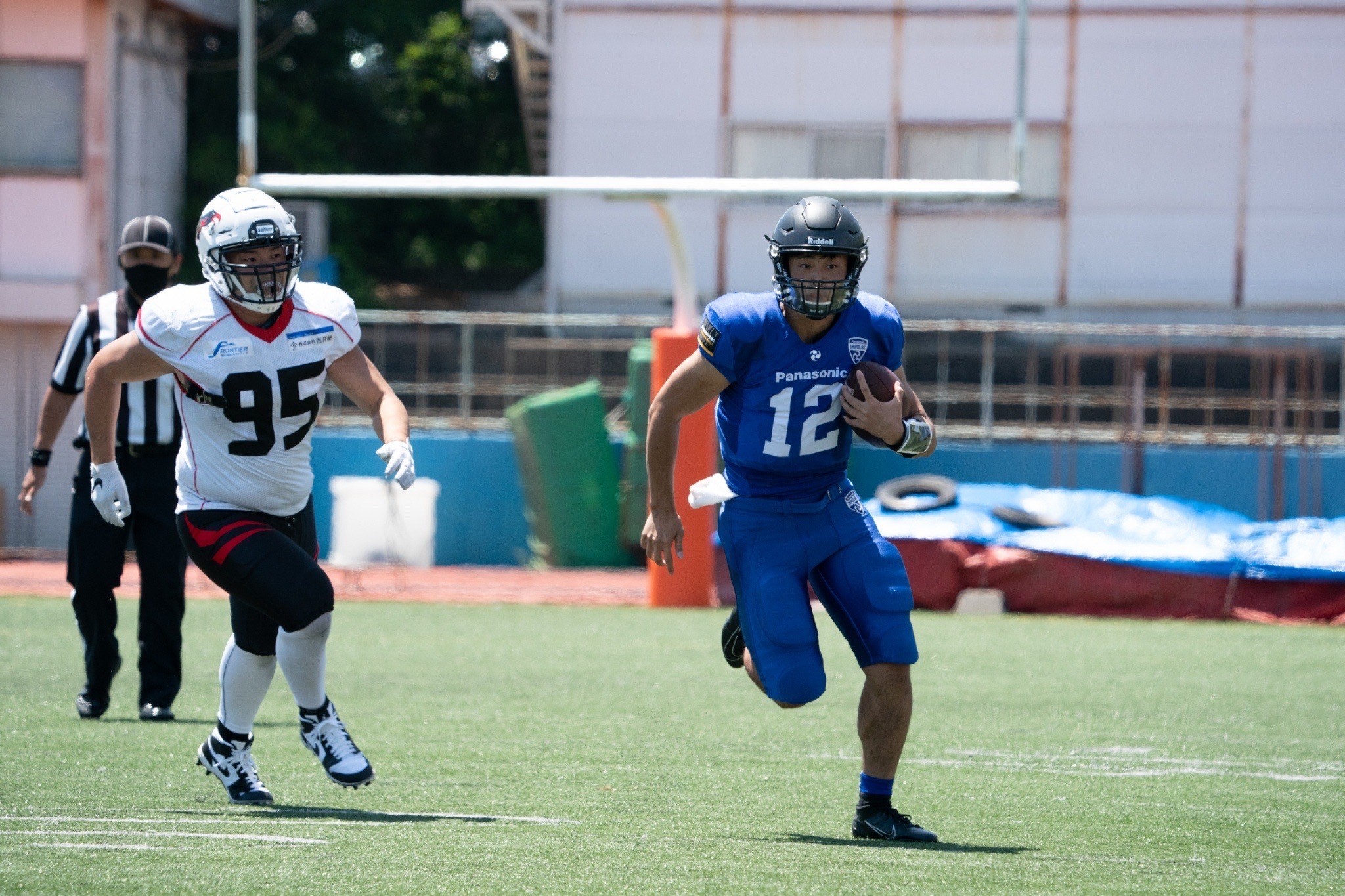 第2Q終盤、自陣37ヤードから始まった攻撃機会には、#12QB荒木優也が、#88WR木戸崇斗、RB牧田、新人#82WR大塩良至にパスを決めて得点圏に進み、RB立川がこの日2つ目のTDにつなげた。
