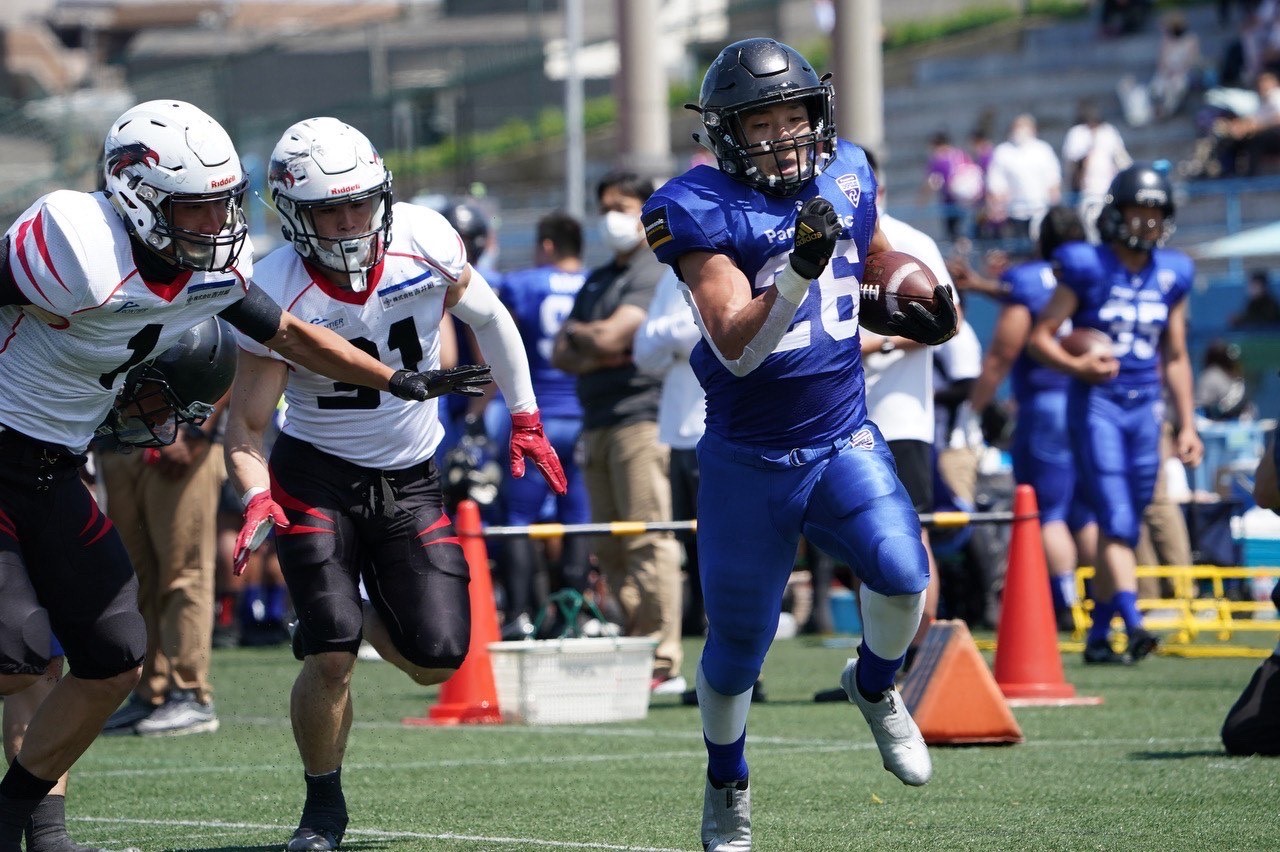 第1Qと第3Qを率いた#8QB石内卓也は、最初の攻撃機会に#9WR高木広次、負傷から復帰した#6TE成田光希へのパスを足がかりに前進し、#42RB立川玄明の11ヤードTDランで先制した。