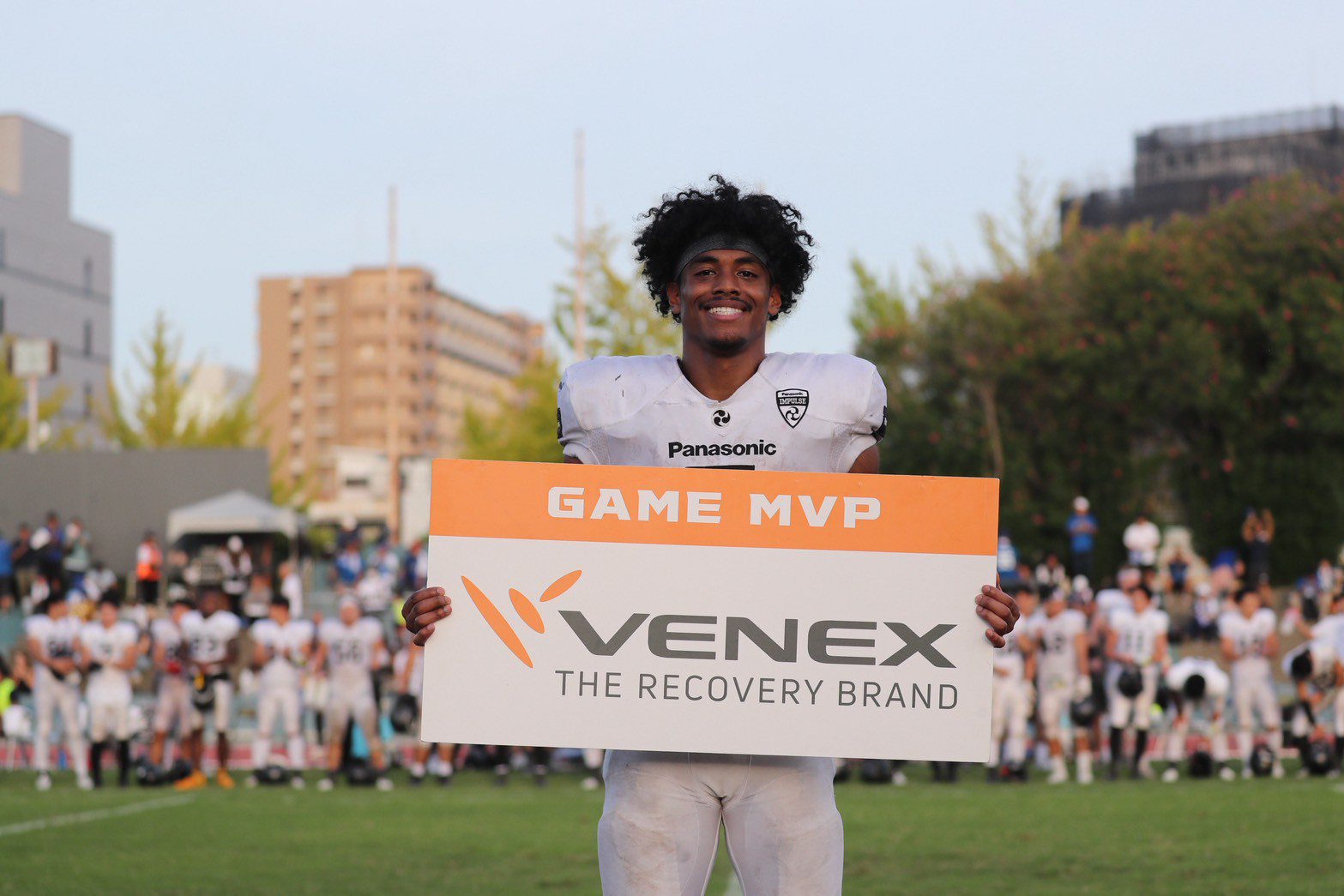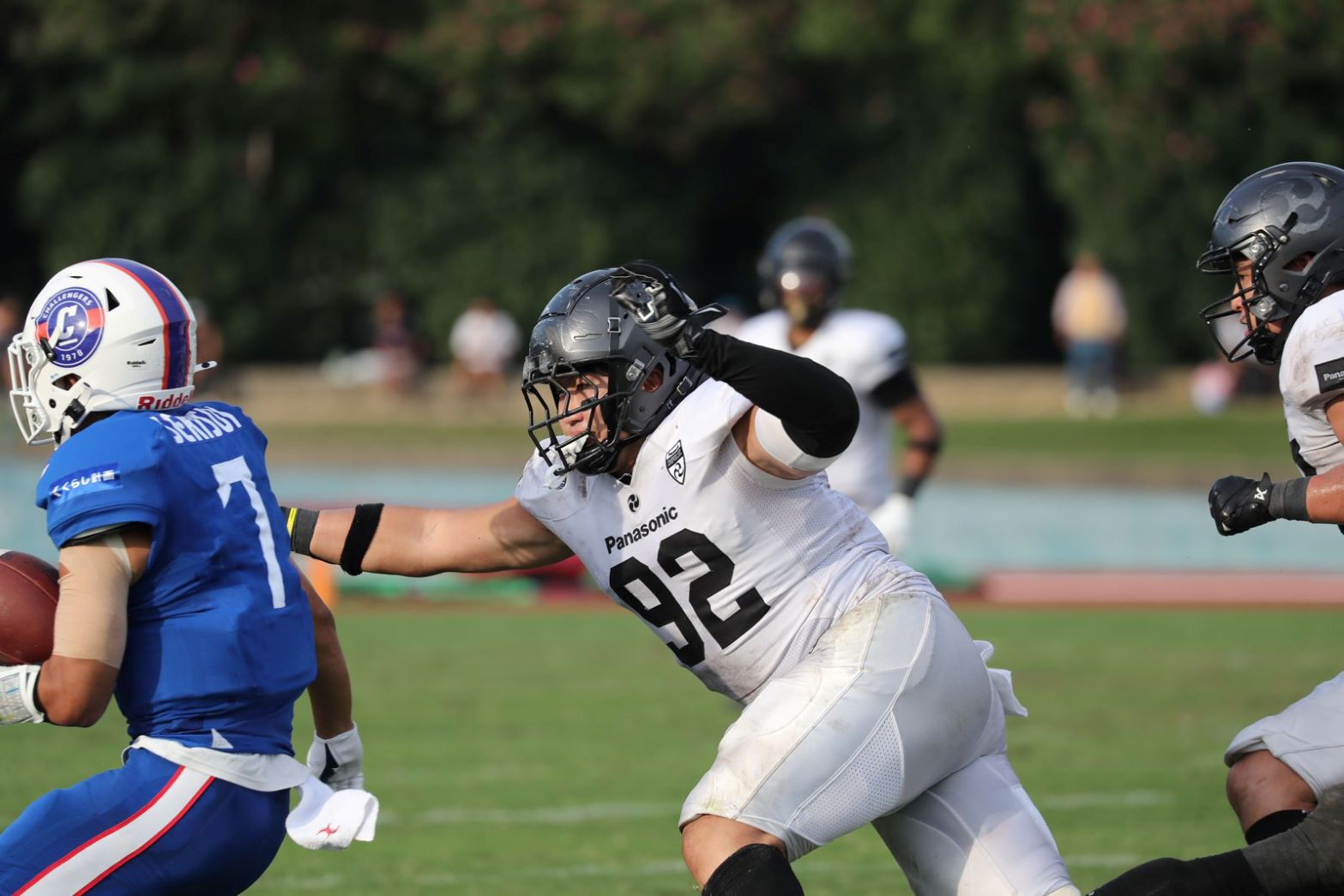 昨年の対戦は1点差で勝利したとはいえ、ほとんど内容は負けに等しい試合だったので、この2週間は本当にチーム全体としてSEKISUIに対しての準備に集中していました。1つ目のインターセプトは相手のQBが外のレシーバーがカバーされているので中のレシーバーに切り替えているということを試合中に感じ取って、張っていました。2つ目のDLのラッシュがとても効いていたので、そのおかげでとれたものだと思います。昨年、子どもが生まれて今日は試合に来てくれていたのですが、かっこいいパパでありたい、かっこいい姿を見せたいという気持ちはあります。今日の守備は良かったですが、まだ試合によってばらつきがあるので、次のエレコム神戸戦にもしっかり準備して、一戦必勝でいきたいと思います。