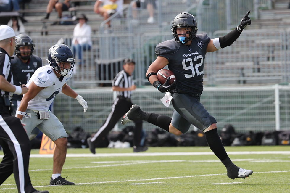 さらに、直後の守備ではエレコム神戸が展開したスペシャルプレーに反応したDL#92有村雄也がボールを奪ってリターンTD。相手の奇襲を返り討ちにしたビッグプレーで、2ポゼッション差を作った。