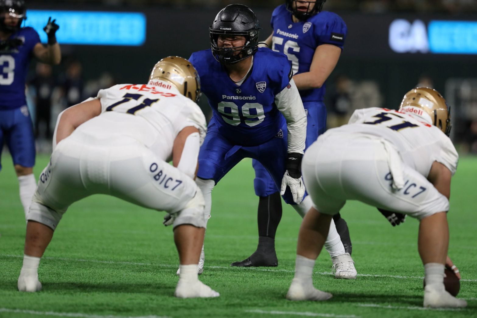 最初の攻撃機会はP#35小林真大の好パントでオービックを自陣3ヤードからの攻撃に追い込む。インパルス守備はLB#1青根奨太、#47小西憂がオービックのランに素早い反応を見せてパントに追い込み、敵陣47ヤードからの攻撃機会を獲得。