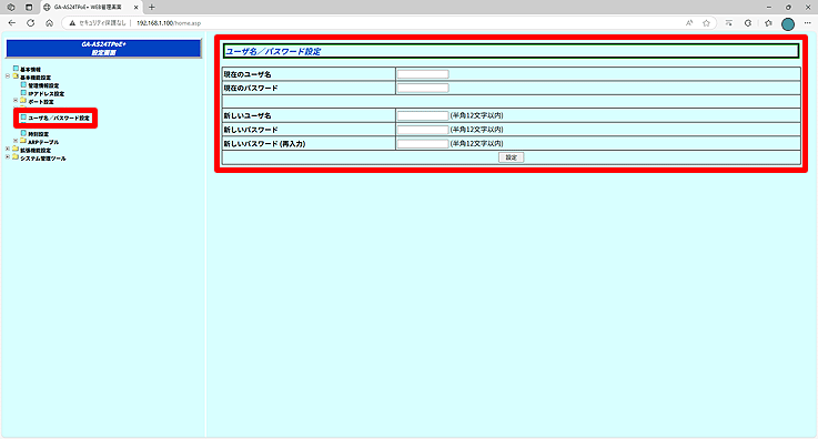 この設定例では、GA-ASシリーズのユーザ名・パスワードの変更について説明します。