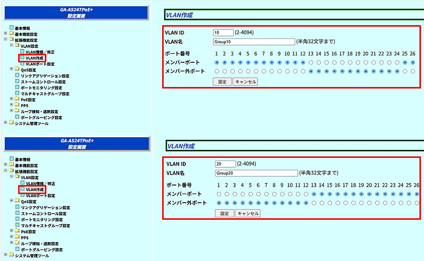 [拡張機能設定] > [VLAN作成] に遷移し、GA-AS24TPoE+①にVLAN10とVLAN20を作成します。(VLAN10:ポート1-12,25-26、VLAN20:ポート13-26)