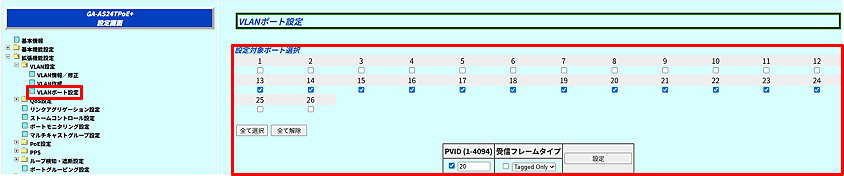 - ポート1-24はUntag(アクセスポート)、ポート25-26はTag(トランクポート)とします。
