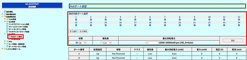 [拡張機能設定] > [PoE設定] > [PoEポート設定] と遷移し、ポートの給電機能をOFF/ONにします。