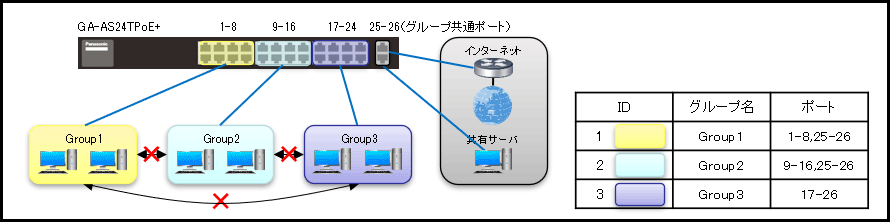 通信を許可するポート同士を「グループ」として割り当てることによって通信経路の制御が可能になります。