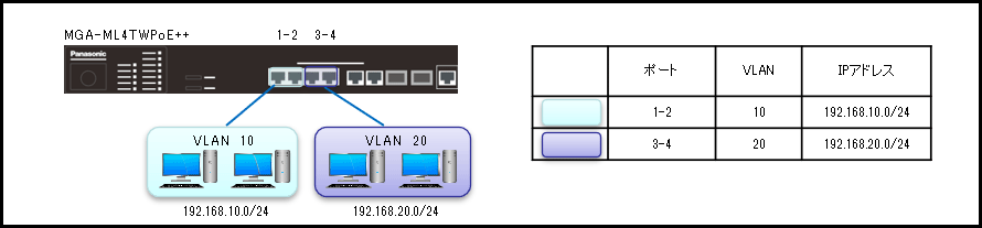 - ポート1-2はVLAN10、ポート3-4はVLAN20とします。