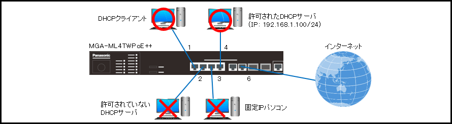 - 指定されたポートに接続されたDHCPクライアントのみ、DHCPサーバからIPアドレスが払い出されネットワークに接続できるにします。