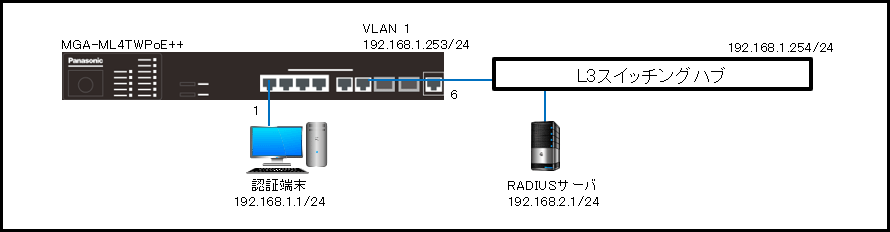 - ポート1-4に端末を接続すると、RADIUSサーバに問い合わせされます。