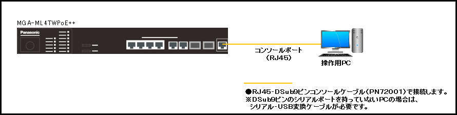 PCとスイッチングハブをコンソールケーブルで接続し、ZEQUO assist Plusなどのターミナルエミュレータにて設定画面を表示します。