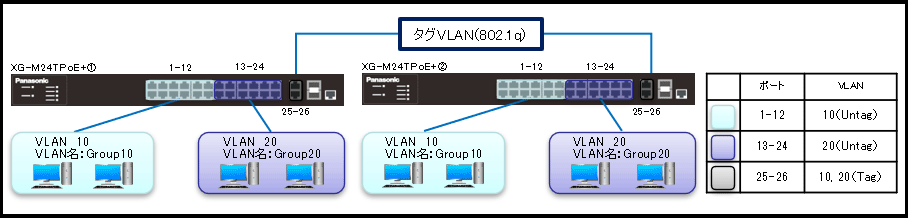 - XG-M24TPoE+をVLAN10とVLAN20にネットワーク分割します。