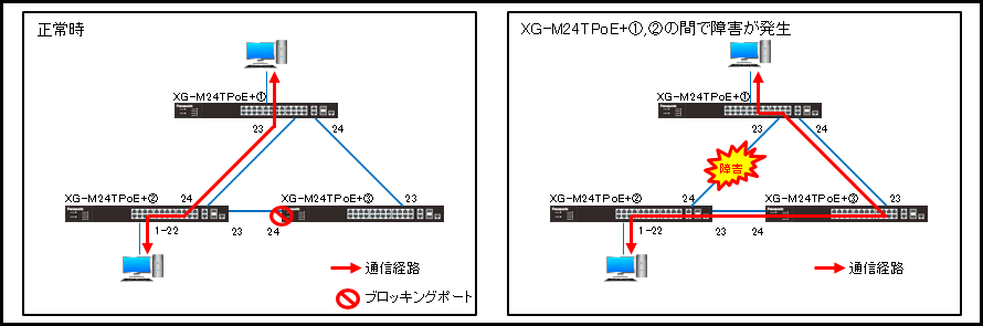 - ブリッジプライオリティが最も大きいXG-M24TPoE+③のポートがブロッキング状態になります。