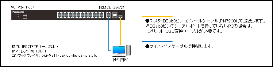 PCとスイッチングハブをコンソールケーブルで接続し、ZEQUO assist Plusなどのターミナルエミュレータにて設定画面を表示します。