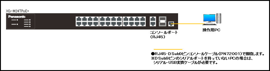 PCとスイッチングハブをコンソールケーブルで接続し、ZEQUO assist Plusなどのターミナルエミュレータにて設定画面を表示します。
