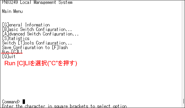 Main MenuからRun [C]LI→ユーザモード→特権モード→グローバルコンフィグレーションモードの順に移行します。