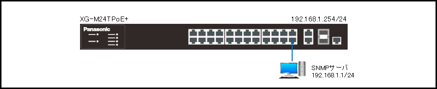 - SNMPサーバ(IPアドレス:192.168.1.1)からXG-M24TPoE+をSNMPで監視します。