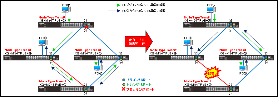 - 正常時はマスターのセカンダリポートがブロッキング状態になり、リング上で障害が発生するとブロッキングが開放されることで通信が継続されます。